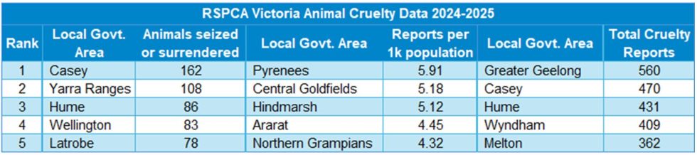 RSPCA Victoria has released its annual Animal Cruelty Report for the 2024/25 financial year and Hume is in the top five.